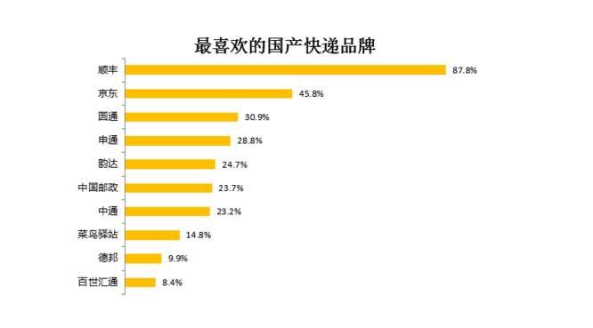 在国产快递品牌中,顺丰占据最受喜欢的国产快递品牌榜的榜首,87.8%的受访者表示最喜欢顺丰,这一水平遥遥领先于其他同行业品牌。京东的受喜爱程度位列第二,提及率为45.8%。圆通以30.9%的提及率位居第三。