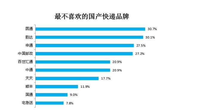受访者最不喜欢的前三大国产快递品牌为圆通、韵达和申通,提及率分别为30.7%、30.1%和27.5%。随着电商平台的发展,快递在我们生活中形影不离,小编也经常网购,相信你也遇到过一些令人抓狂快递公司的快递公司。